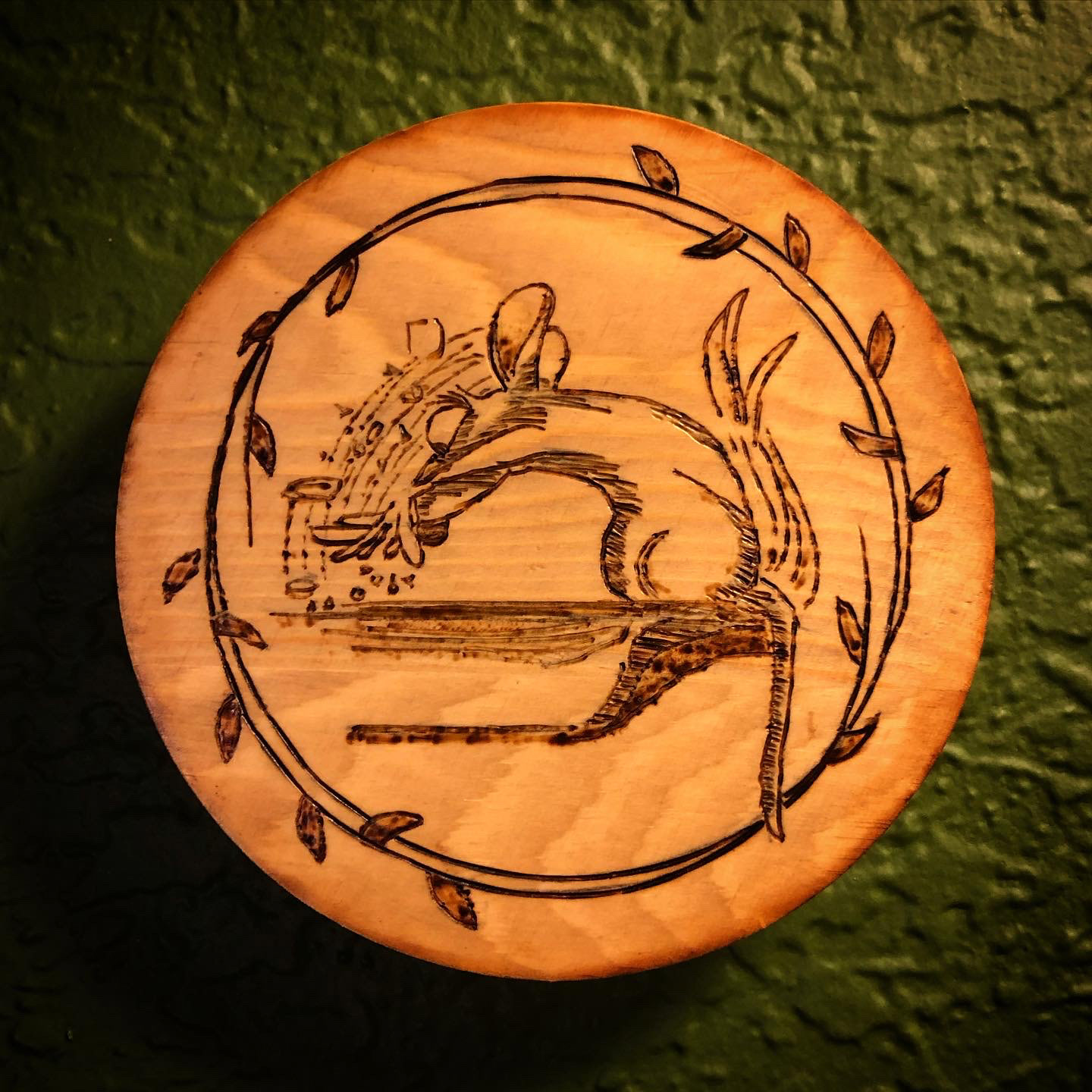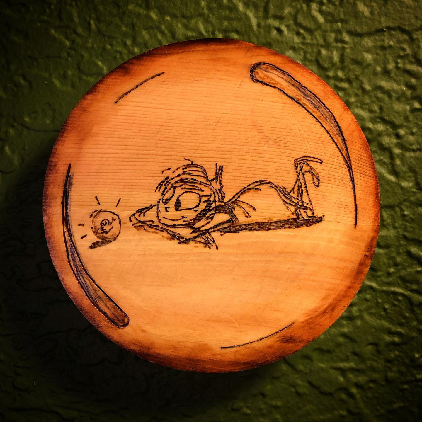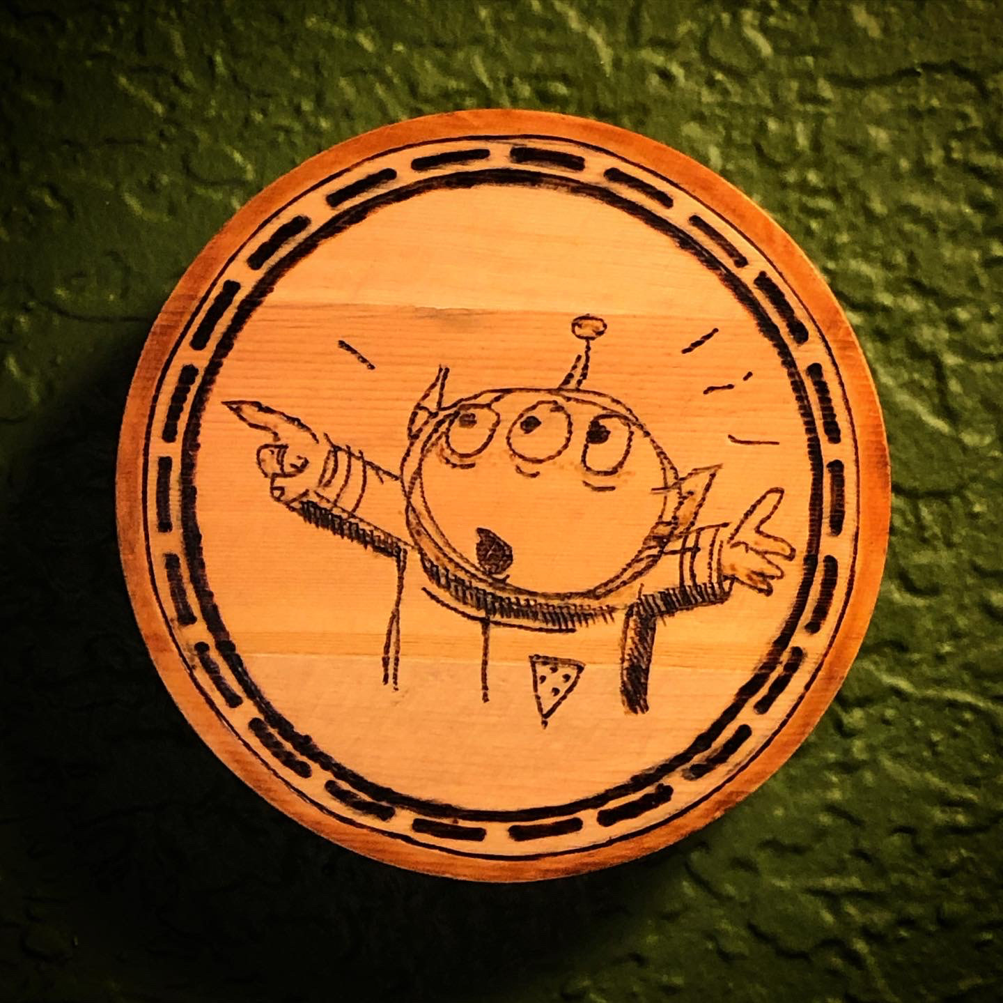 made for colleagues inspired by their favorite pixar character's concept art, and wood-burned on pine with a light oak stain.